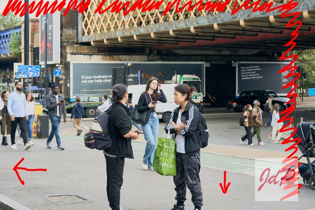 In "Distractions" I did not allow myself enough time to study the flow of humanity in front of Waterloo Station. Had I taken my time I would have composed this image towards the left and crouched down. There was not enough time to wait for the baby's pushchair to enter the frame given the timing of the flick of hair and the visual tension in the foreground - these two elements coexisted for a moment!